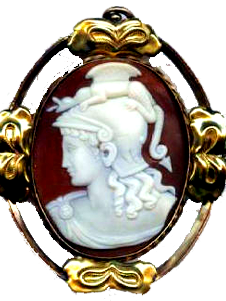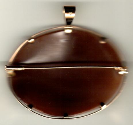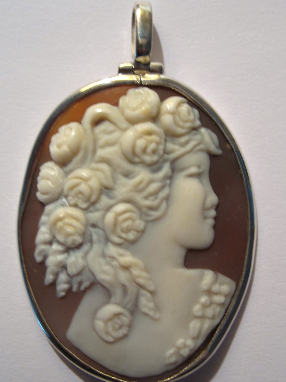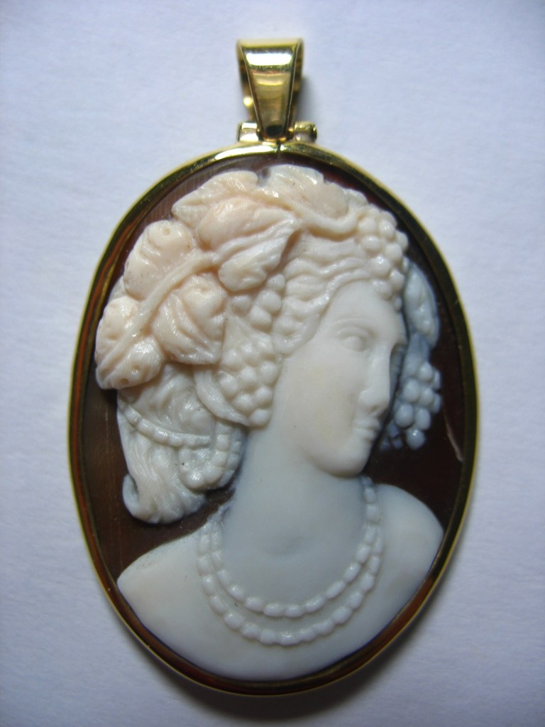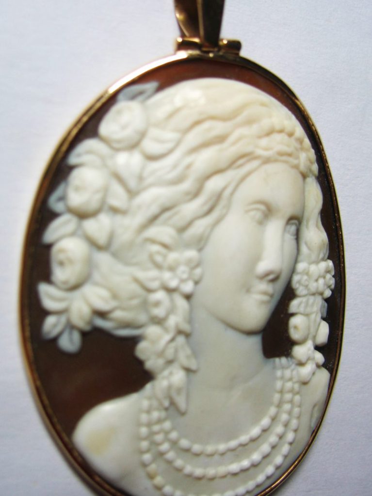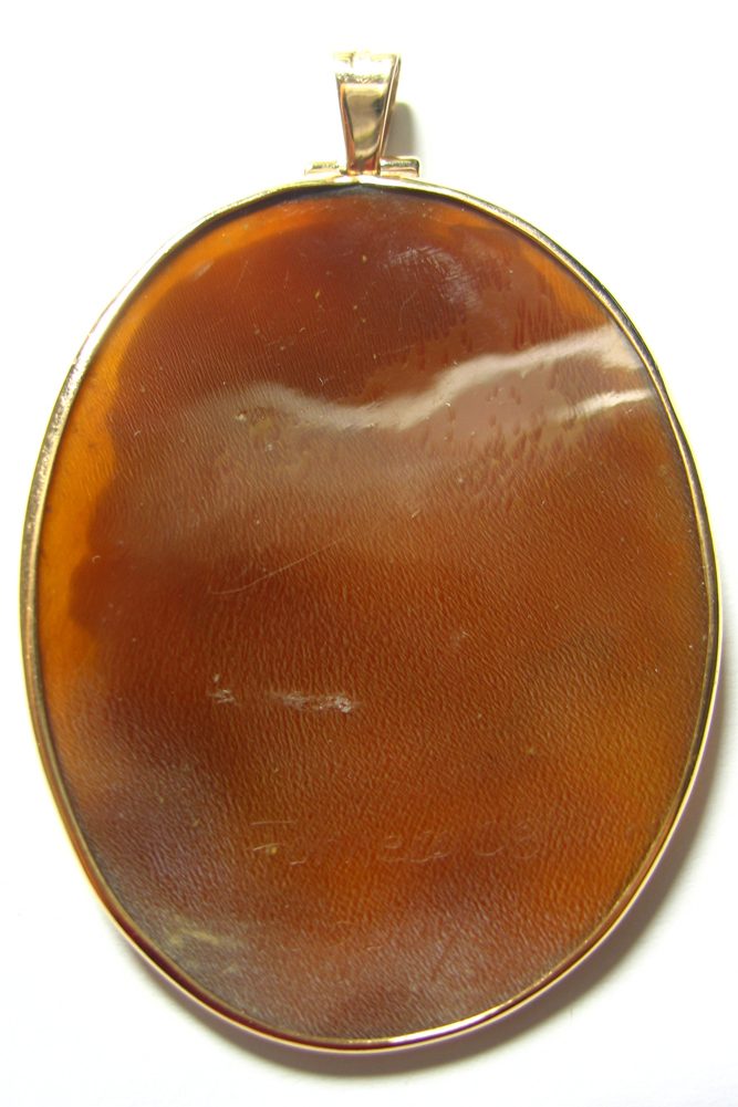 Cameo dimensions: 48 mm long by 37 mm wide. The frame was worked in 12k gold; it measures 69 mm long by 60 mm wide, and the weight of the gold is 14 grams. The total weight of the cameo is 21 grams.