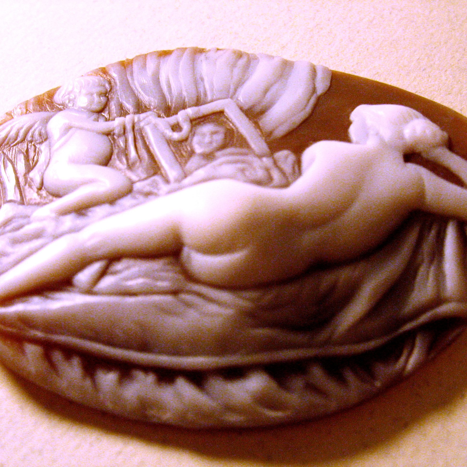 Cameo worked throughout the art of sculpture in an exotic seashell type cassis madagascariensis.
