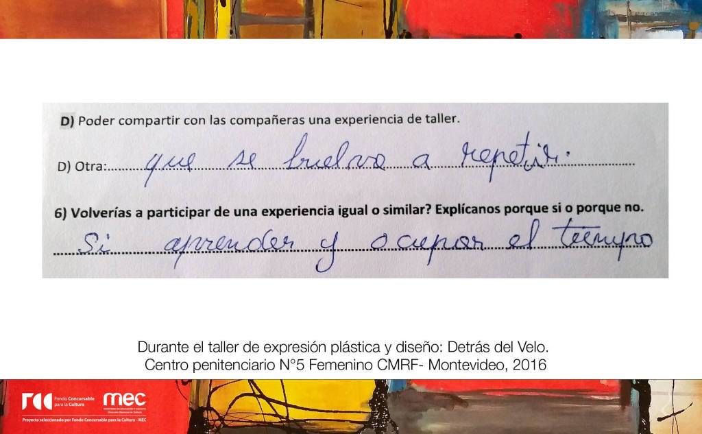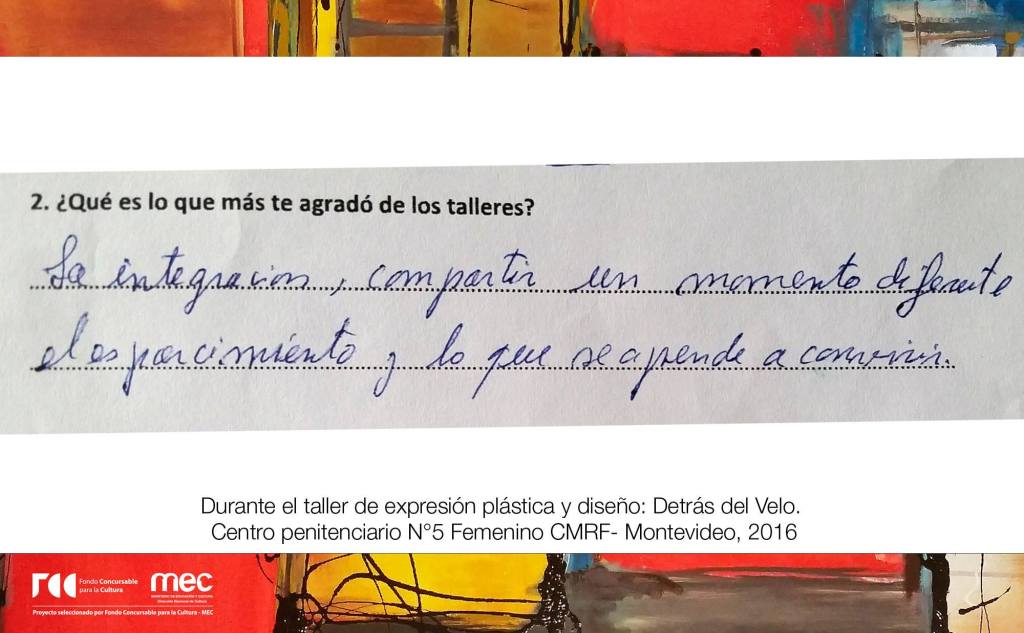 Proyecto ganador en los FCC para la cultura 2015, categoría Artes Visuales. El mismo fué llevado a cabo en el año 2016 en el Centro Penitenciario Femenino (CMRF N ° 5), ubicado en la ciudad de Colón, departamento de Montevideo.