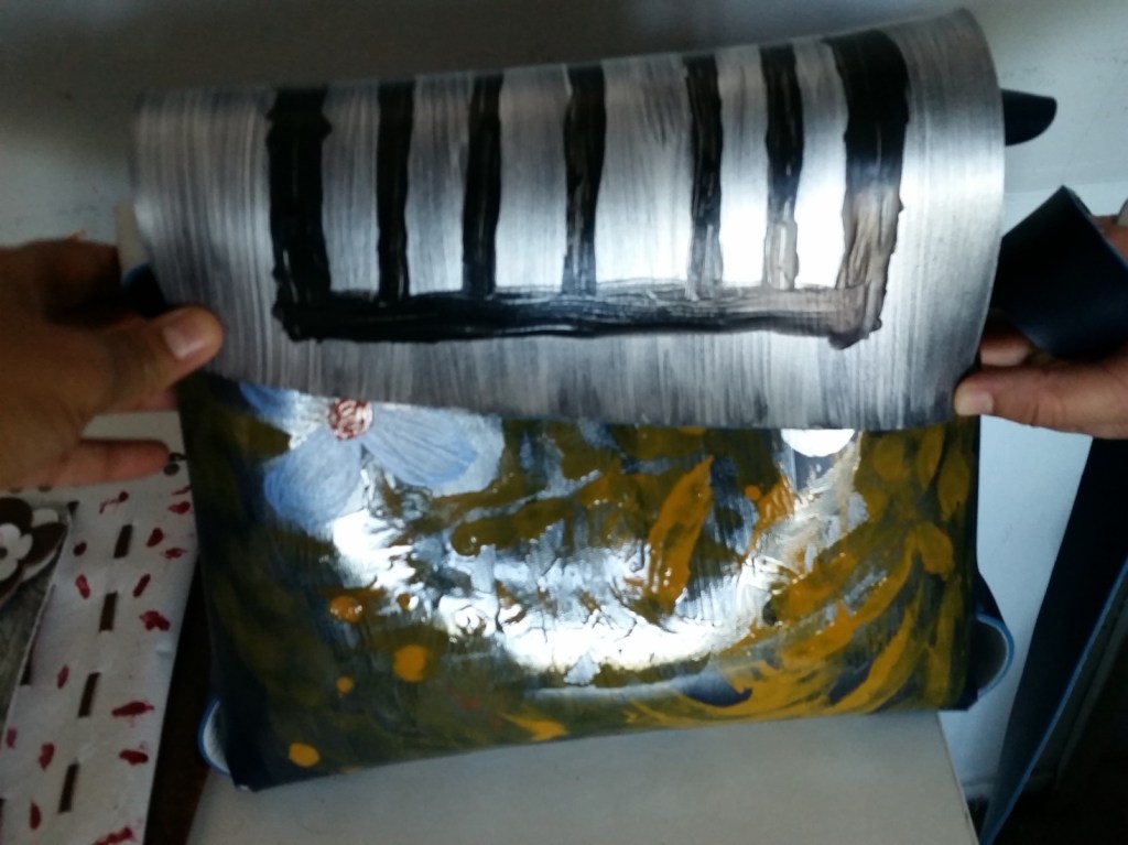 La pintura se realizó sobre cuero ecológico y luego se trabajó el proceso de diseño, el cual tomó un recorte de la obra para ser transformado en un morral de uso personal.