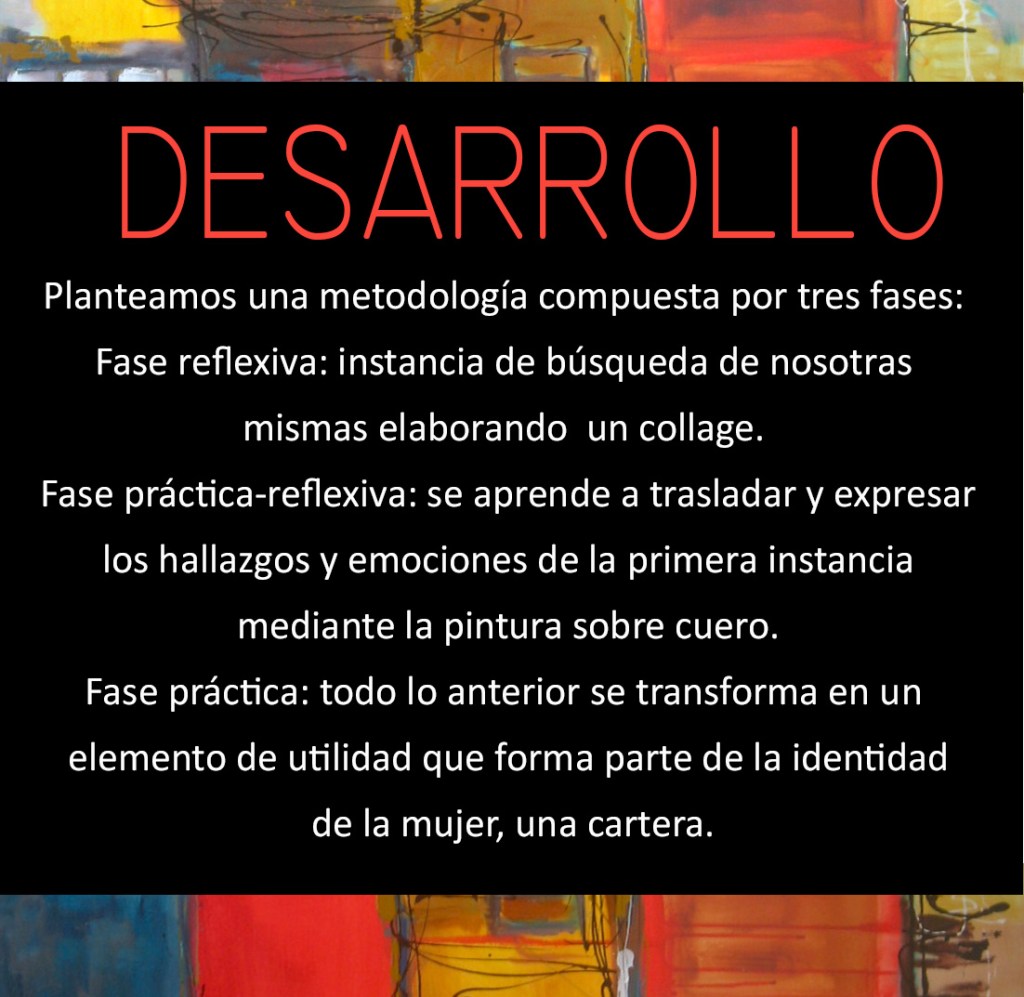 Los talleres fueron programados en base a la realización de una obra pictórica y su posterior transformación en un producto de diseño. Los mismos fueron de cuatro horas de duración cada uno y se trabajó el proceso artístico y de diseño a partir de una premisa de trabajo.